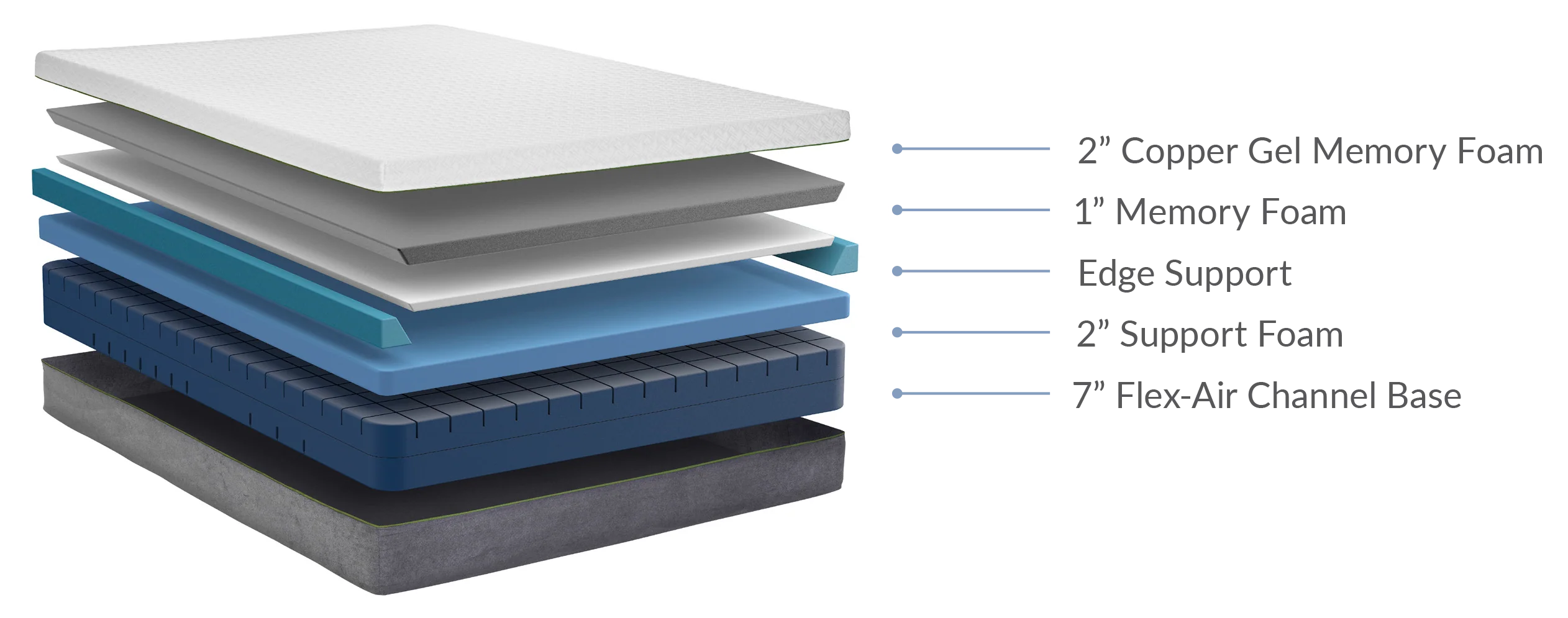 Copper is recognized as an essential mineral with health benefits like increased collagen production, energy levels, and iron absorption. The top layer of 2” Copper Memory Foam has antimicrobial properties that neutralize temperatures and dissipate odors. The 1” layer of Memory Foam prevents motion transfer, while the 2” Support Foam and 7”Air Grid™ Base work together to provide reinforced support for a longer-lasting mattress.