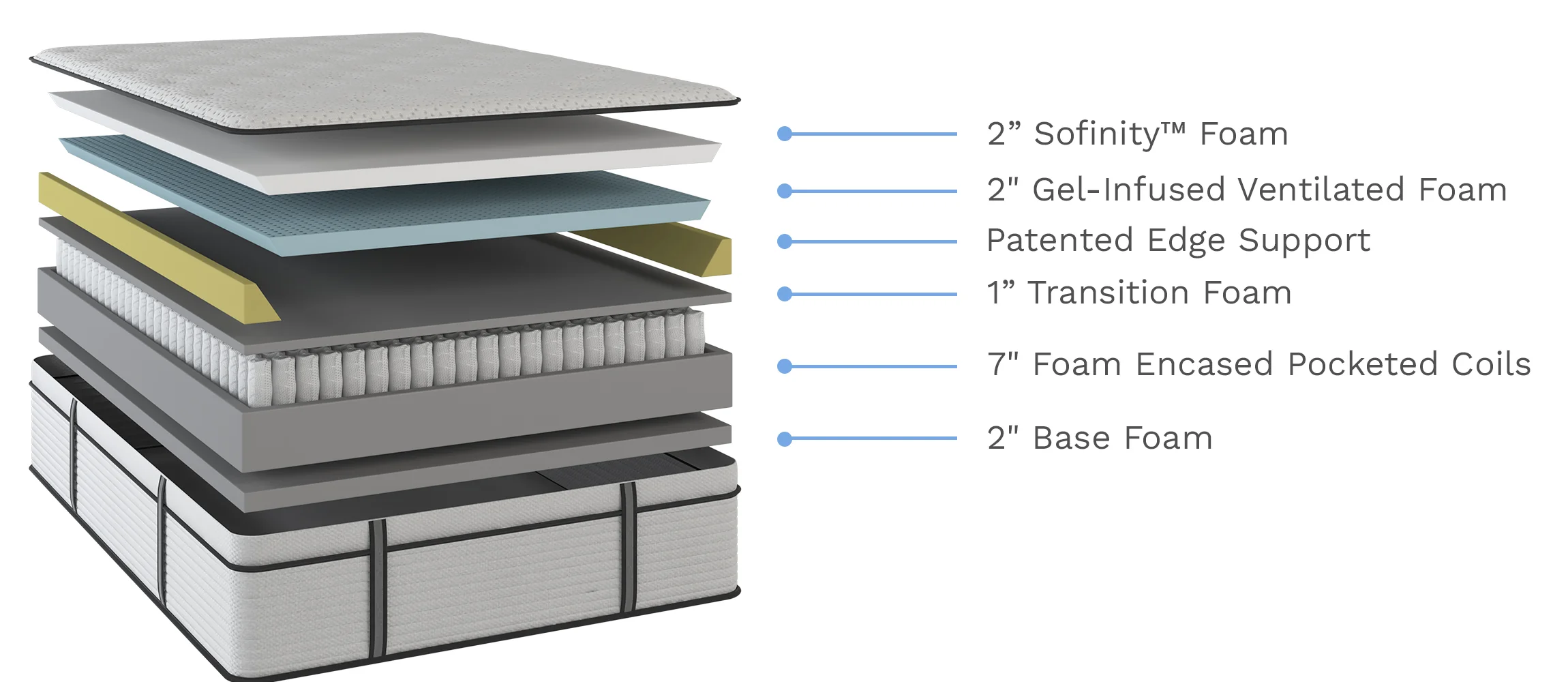 Experience revolutionary breathability, comfort and ergonomic precision with this expertly engineered mattress, the 14” Sofinity™ Hybrid Plus. Inside the mattress the 2″ layer of Sofinity™ Foam delivers next-level breathability with twice the airflow for cooler, more refreshing sleep, while the 2” Gel Infused Ventilated Foam provides an added layer of ventilation and cooling for maximum comfort. The Patented Edge Support System expands your comfort zone with 20% more usable sleeping surface and stability from edge to edge. At its core, 7″ Foam-Encased Pocketed Coils conform to your unique shape, reducing motion transfer and enhancing airflow along with a 2” Base Foam for added support. Wrapped in a soft Tencel™ cover that wicks away moisture and regulates body temperature, this mattress is designed to deliver ergonomic alignment, cooling comfort, and restorative sleep night after night.
